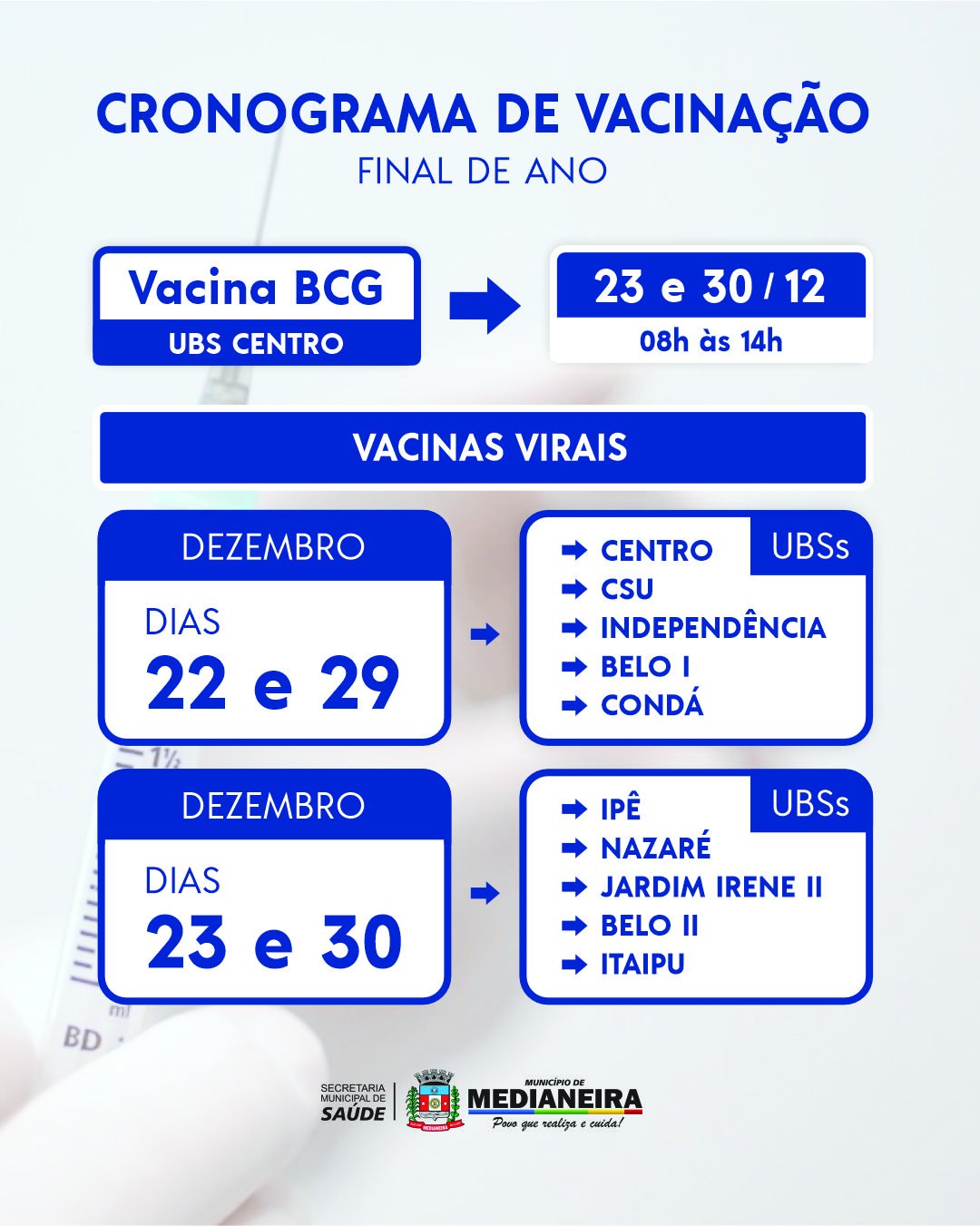 Tendo em vista os feriados de final de ano a Secretaria de Saúde de Medianeira divulgou um cronograma das vacinas virais, para otimizar as doses tendo em vista que são frascos multidoses com validade curta.