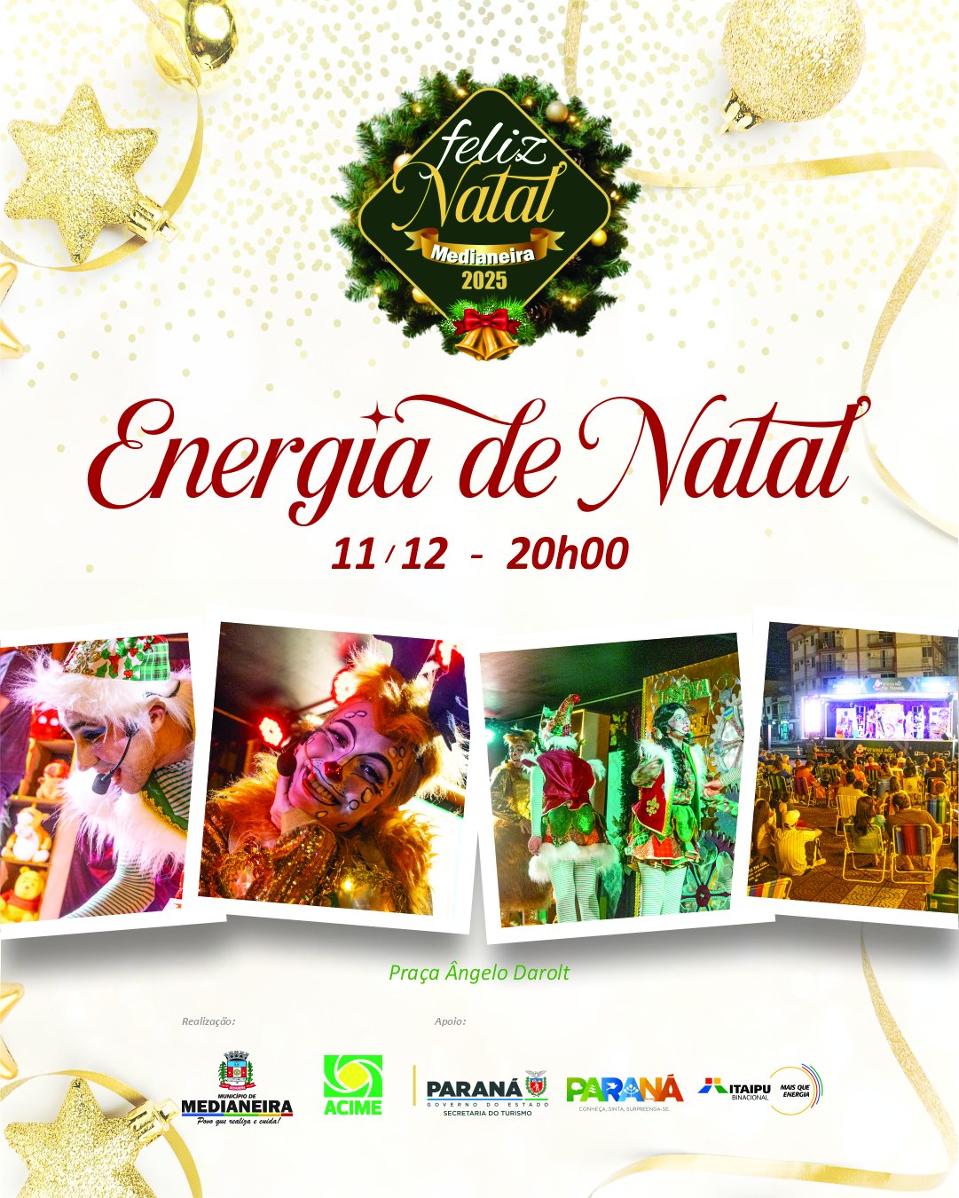 Nesta quinta-feira (11) Medianeira vive a magia do Natal com o espetáculo “Energia de Natal” da Itaipu Binacional, as 20 horas na praça Ângelo Darolt.