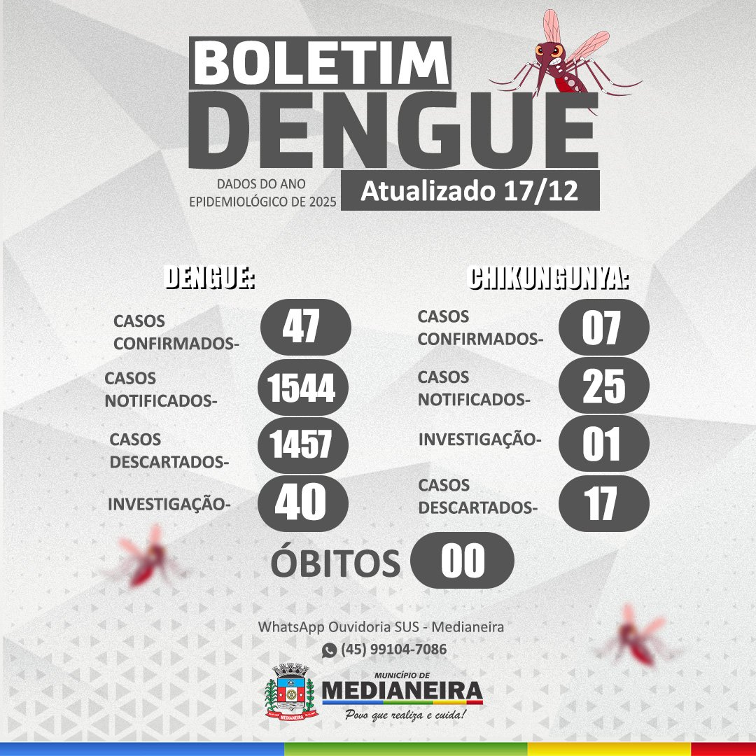 DENGUE: O município registrou até o momento 1544 notificações, 47 foram confirmadas, sendo 02 com sinais de alarme, 1457 foram descartados e 40 estão em investigação.