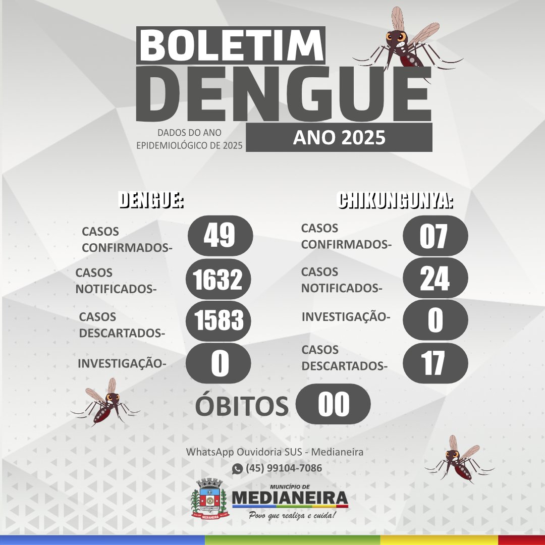 Com o encerramento do boletim epidemiológico referente ao ano de 2025, a Secretaria Municipal de Saúde reafirma seu compromisso com as ações de vigilância, prevenção e controle da dengue e da chikungunya no município.