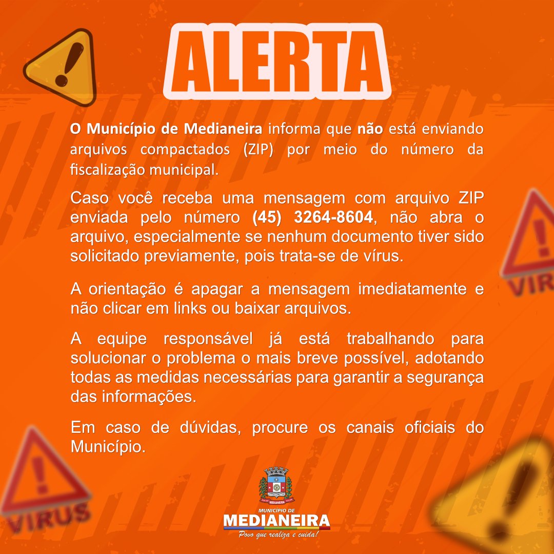 Caso você receba uma mensagem com arquivo ZIP enviada pelo número (45) 3264-8604, não abra o arquivo, especialmente se nenhum documento tiver sido solicitado previamente, pois trata-se de vírus.