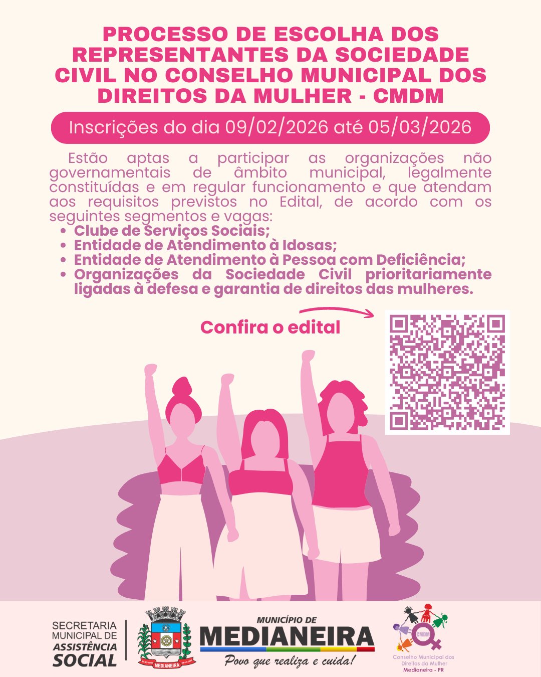 O edital completo está disponível em: https://medianeira.pr.gov.br/arquivos/acaosocial/conselhos/CMDM/resolucoes/2026-02-09_edital_no_01_2026.pdf