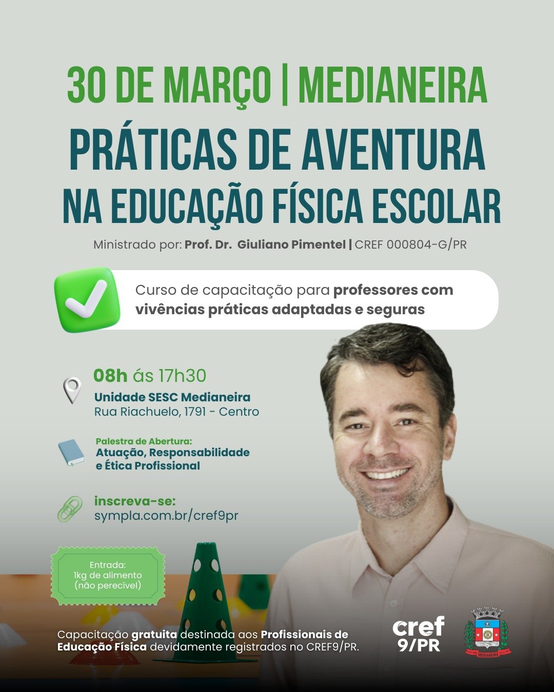 O CREF9/PR promove o curso Práticas de Aventura na Educação Física Escolar, ministrado pelo Prof Dr Giuliano Pimentel, com vivências práticas adaptadas e seguras para aplicação no contexto escolar.