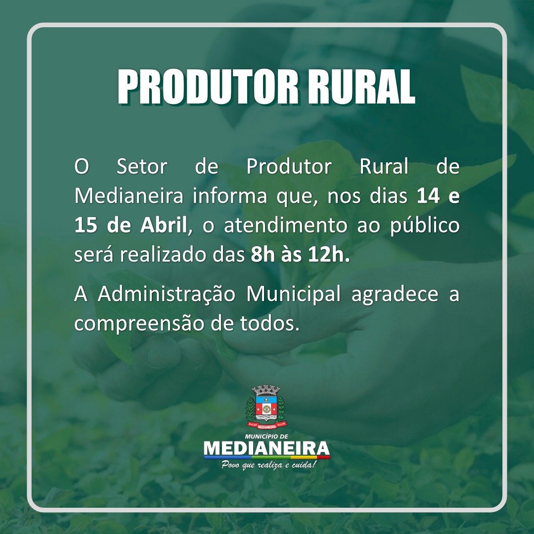 Nos dias 14 e 15 de abril o atendimento do Setor de Produtor Rural será realizado em horário reduzido.