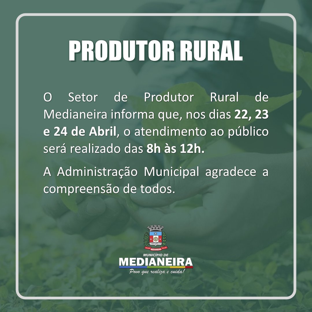 Nos dias 22, 23 e 24 de abril o atendimento do Setor de Produtor Rural será realizado em horário reduzido.