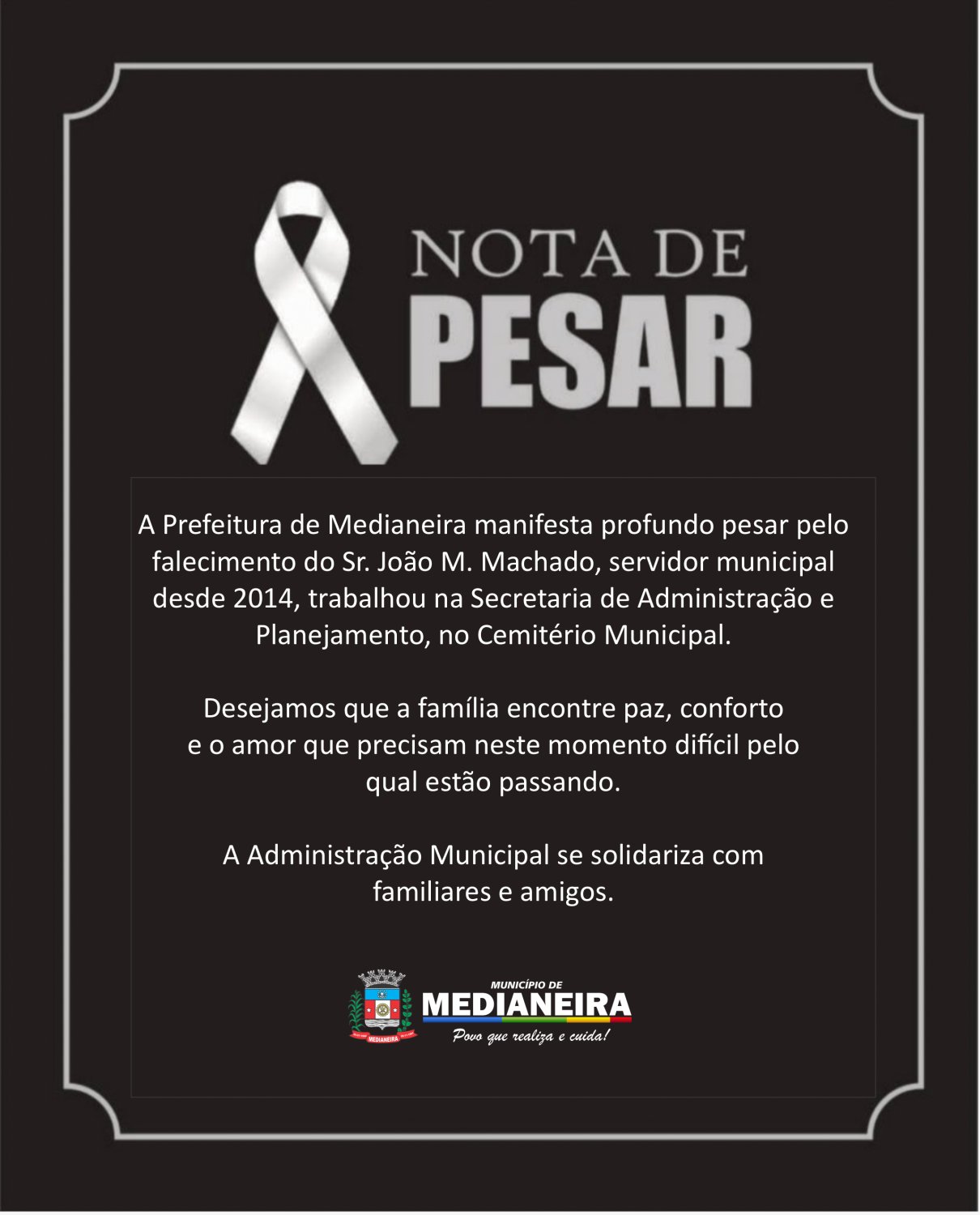 A Prefeitura de Medianeira manifesta profundo pesar pelo falecimento do Sr. João M. Machado, servidor municipal